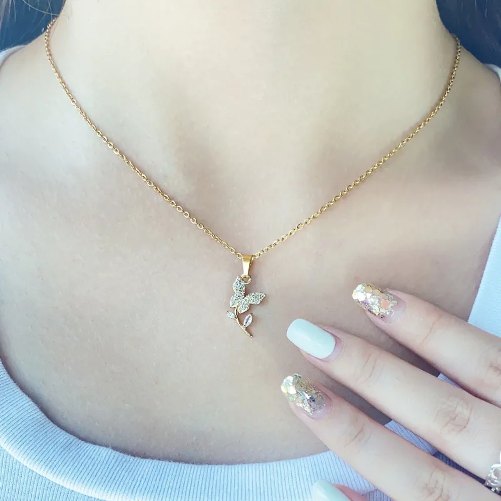 Diese filigrane Halskette überzeugt durch ihr elegantes Design und liebevolle Details. Der fein gearbeitete Schmetterlingsanhänger, besetzt mit funkelnden Kristallsteinen, verleiht dem Schmuckstück eine feminine und zugleich moderne Ausstrahlung.